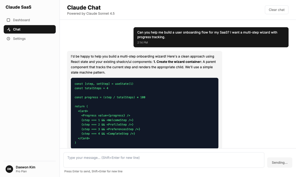 The ONLY Next.js boilerplate built for Claude Sonnet 4.5. Ship your AI SaaS in hours, not weeks. Includes auth, streaming chat, Stripe billing, admin dashboard, 40 tests, and 1,300+ lines of docs.