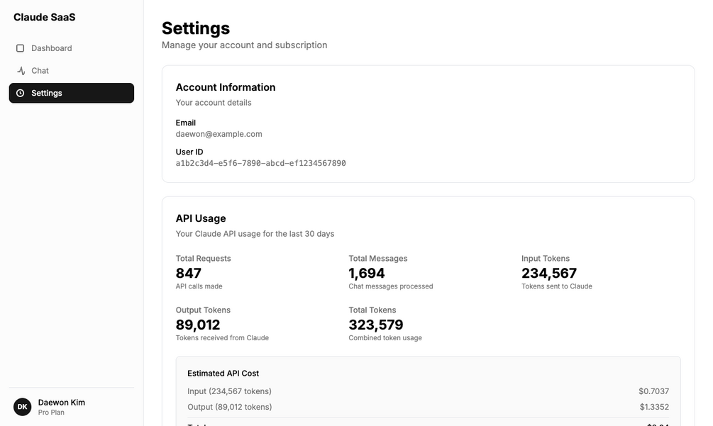 - Usage metering — Track API calls, tokens, and estimated costs per user