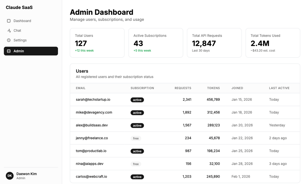 - Admin dashboard — User management, subscription overview, usage analytics